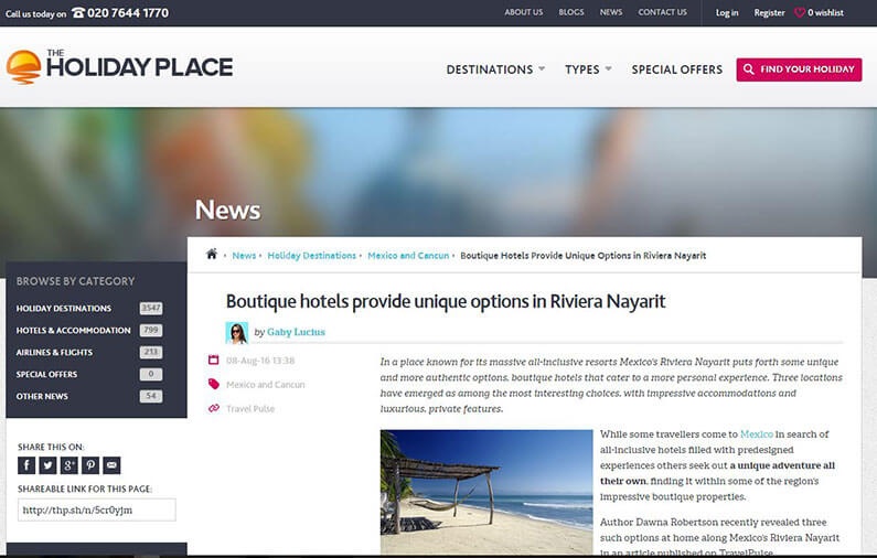 Located on the Pacific coast of Mexico, Riviera Nayarit is described as an area rich with boutique hotels, bed and breakfasts and eco-tourism inns. Robertson outlines some of the more interesting choices she found following a recent visit to the region.
