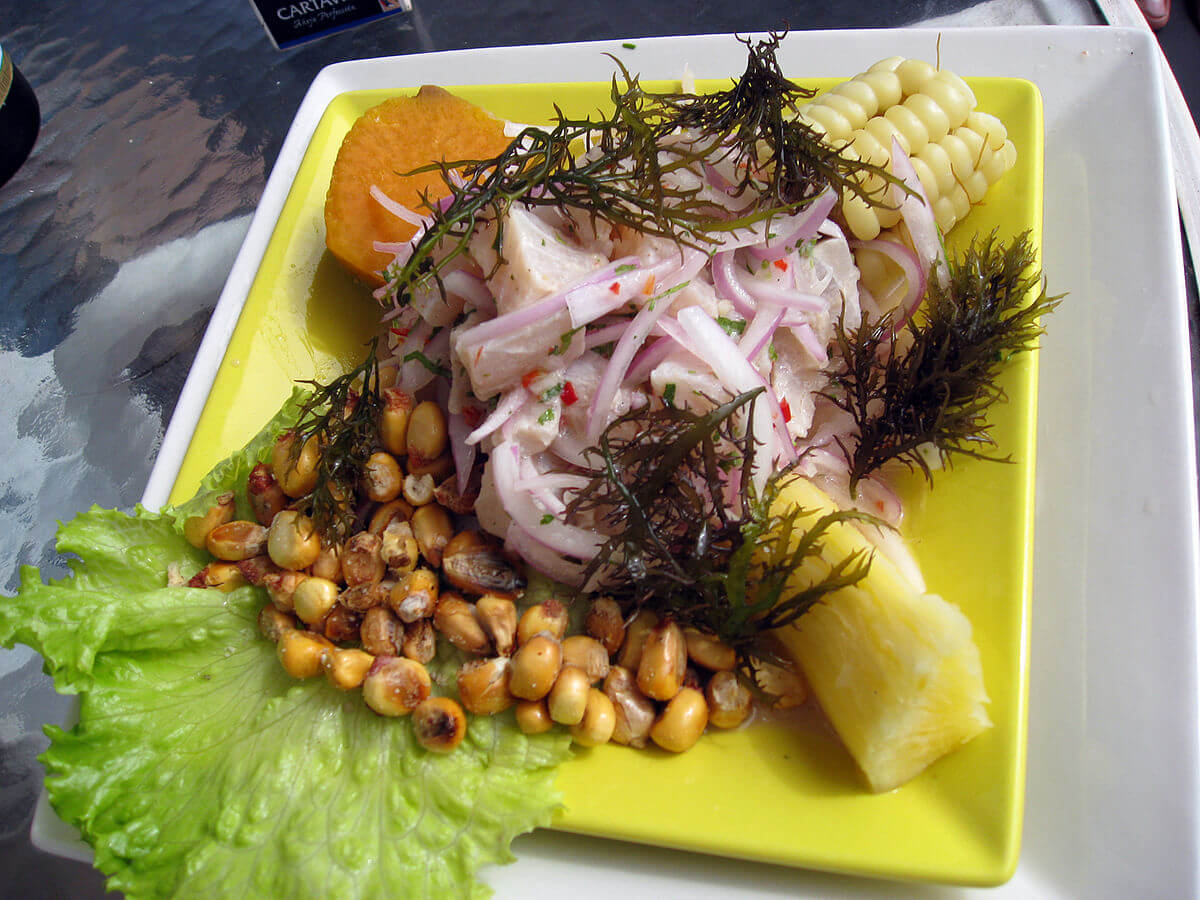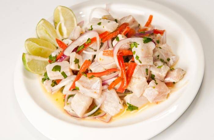 PERUVIAN CEVICHE – The key piece to prepare the original recipe of Peruvian ceviche is the kind of fish to use. Tradition has it that you must use sole or grouper, but they can be substituted by croaker. Another important instruction to adhere completely to the original recipe is that fish meat must not be left in lime juice more than ten minutes, as the idea is to marinate rather than cure. Chili, onion, cilantro and salt are the rest of the ingredients.