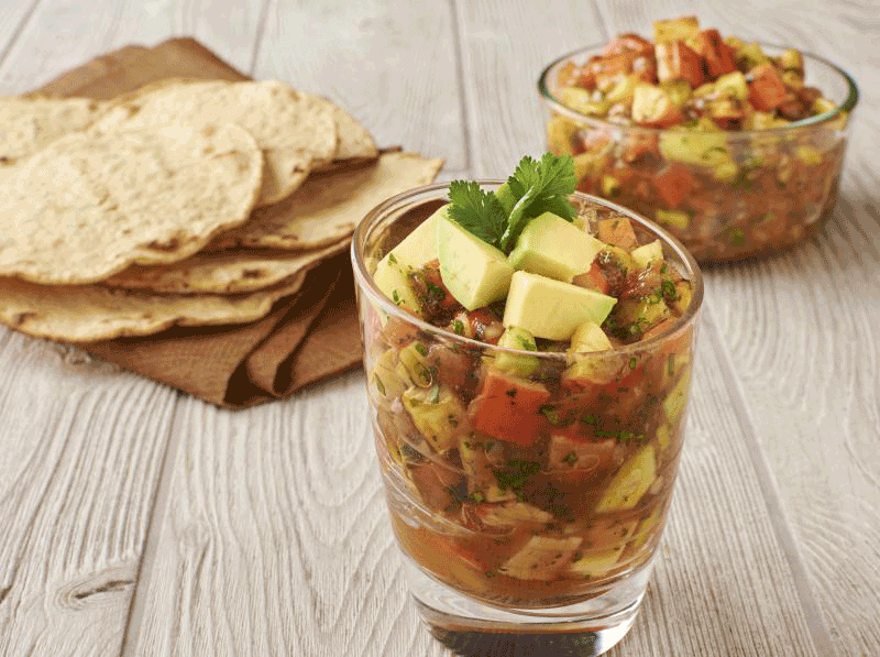 SURIMI AND MANGO CEVICHE – The tropical-ness and deliciousness of mango, combined with the freshness of fish surimi, makes an excellent fusion to prepare a delicious ceviche, to which you can add tomato, onion and cilantro.