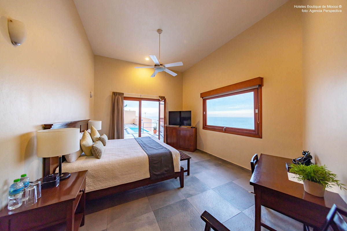 Ubicada en el tercer piso con vista al Océano Pacífico y el acceso inmediato a la piscina de borde infinito, Lupita ofrece una vista sin obstáculos del océano desde la cama.