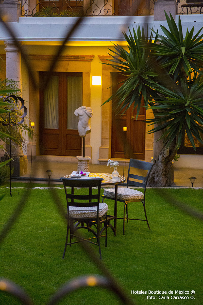Los jardines del hotel forman parte del atractivo pues podrá gozar en las terrazas de la habitacionesCasa-mateo-13, además fuera de su restaurante cuenta con una pequeña terraza con vista a la alberca, mesas con sombrillas para tomar los alimentos o beber algo.