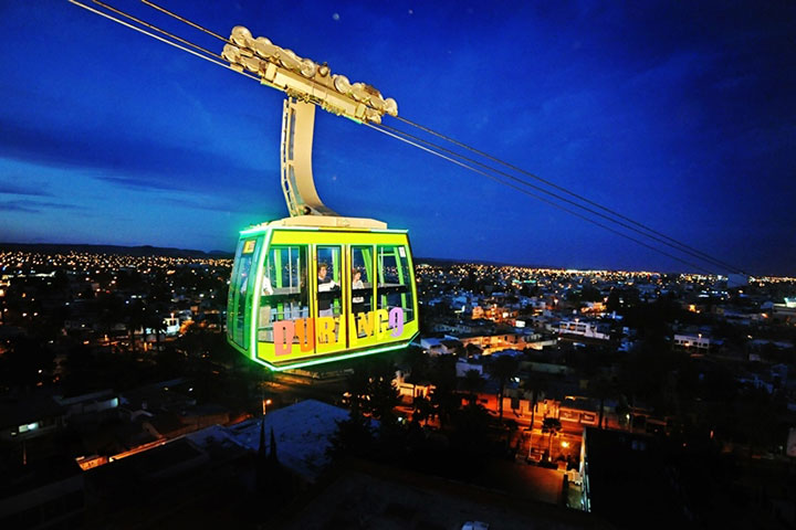 Desde el año 2016 este teleférico cruza justamente por el centro de la capital y además de recorrer 750 metros de incomparables vistas, se tiene la posibilidad de conocer las más fantásticas historias de Durango contadas por guías turísticos, expertos y apasionados por su ciudad durante el trayecto. En su mirador se llevan a cabo evento culturales y funciones de cine al aire libre.
