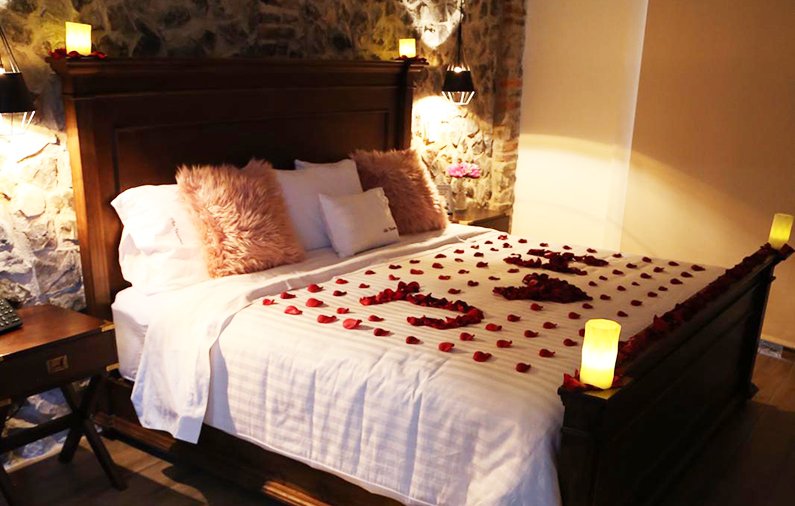 • Decoración de la habitación con pétalos, velas artificiales y rosas