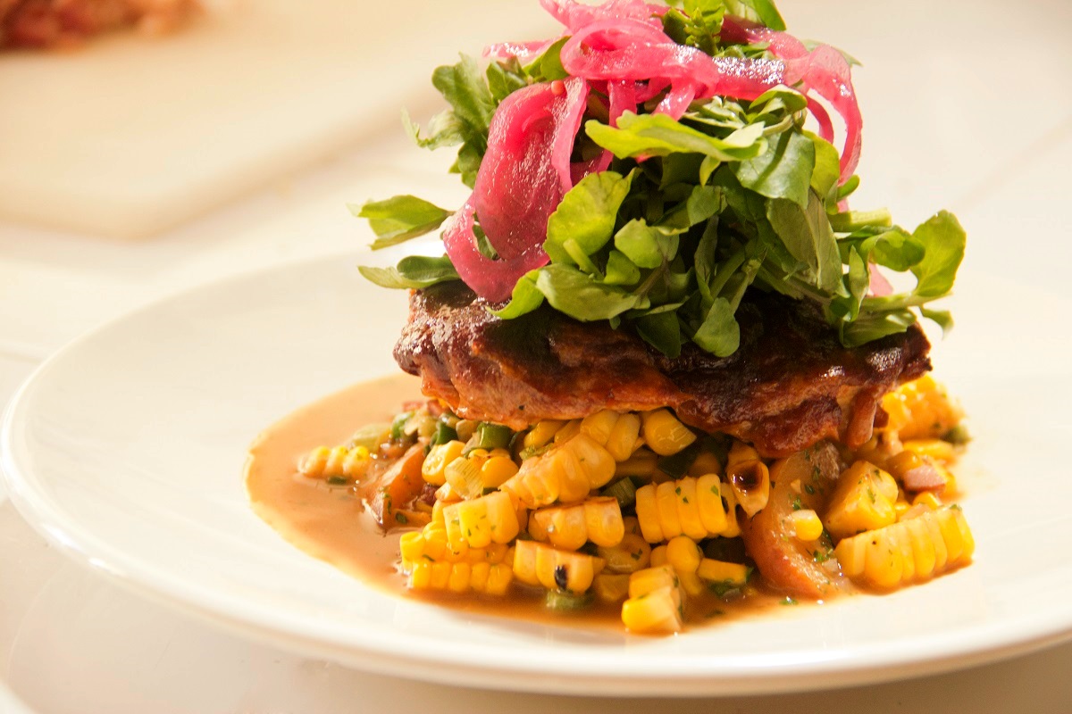 Tocino fresco braceado, salsa verde, creme fraiche, frijoles refritos